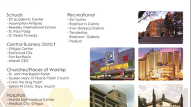 Malls/Supermarkets: SM Taytay; Robinsons Cainta; Robinsons Antipolo; Tiendesitas; Primark Town Center Cainta Rizal; CK Square; Walter Mart Taytay; SM Savemore Market; Roque Supermarket