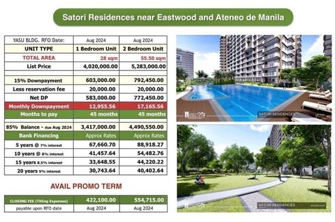 2 Bedroom Condo SATORI RESIDENCES in Pasig near Eastwood and Ateneo De Manila