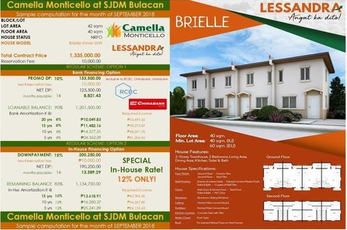 TCP: Php 1,335,000Rservation Fee: Php 10,000Regular 10% DP: Php 133,50014 months DP: Php 8,82190% Loan Amount: Php 1,201,5005 years at 8%: Php 24,36210 years at 8%: Php 14,57815 years at 8%: Php 11,48220 years at 8%: Php 10,050