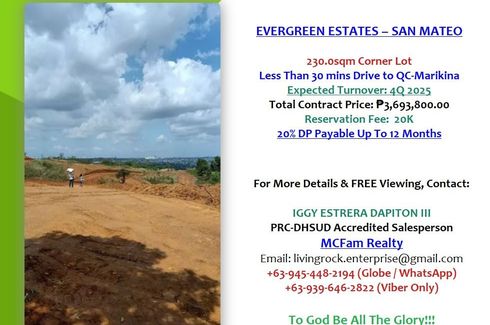 PRIME RESIDENTIAL CORNER LOT IDEAL FOR VACATION HOUSE 230.0sqm EVERGREEN ESTATES SAN MATEO – RIZAL ONLY 20K TO RESERVE