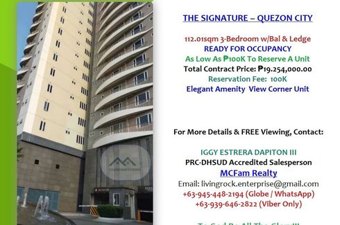 FOR SALE: ELEGANT WELL-SECURED 112.01sqm 3-BEDROOM w/BALCONY & LEDGE THE SIGNATURE QUEZON CITY 100K RESERVATION FEE