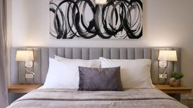 This stylish furnished studio with modern interiors features a cushioned bed with a pull-out trundle, ideal for guests or maximizing sleeping space. Built-in floating nightstands, ambient wall lamps, and a tufted headboard elevate the sleeping area, while blackout curtains ensure restful nights. A minimalist abstract artwork adds a touch of modern flair above the bed.