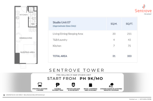 Pre-selling Studio Unit For Sale in Sentrove Tower Clover Leaf Balintawak, Q.C