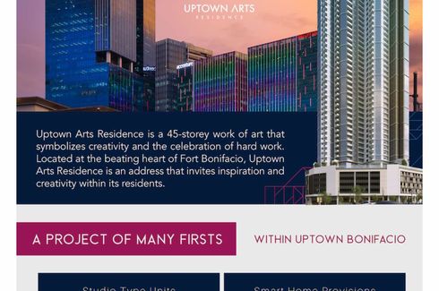 Rent to Own Executive Studio Unit for Sale in Uptown Arts Residence, BGC, for as Low as P23,000 per month! Move in with only 10% payment