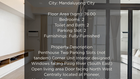Penthouse Two Parking Slots (not tandem) Corner Unit Interior designed Windows facing Pasig River (South East) Open living area Door facing North West Centrally located at Pioneer, Mandaluyong Easy access to Makati (via Guadalupe),