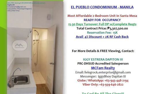 🏈🌽🌹EL PUEBLO CONDOMINIUM – ANNEX A PROJECT THE MOST AFFORDABLE CONDO UNIT IN SANTA MESA AREA ONLY 135K PRICE PER Sq.M.🏈READY FOR OCCUPANCY 24.5sqm 2-BEDROOM TOTAL AREA GRANDE MODEL🏈IDEAL FOR END-USE OR FOR RENTAL BUSINESS - EASY TO LEASE OUT, FEW WALKS AWAY TO PUP MAIN CAMPUS, FULLY SECURED & WELL MAINTAINED PROPERTY🌹🌽🏈