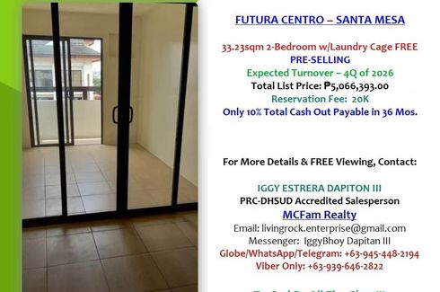 Contract Price 5.6M w/253K Discount Cash Payment Pre-Selling 33.23sqm 2-Bedroom w/Laundry Cage Futura Centro Santa Mesa, Manila