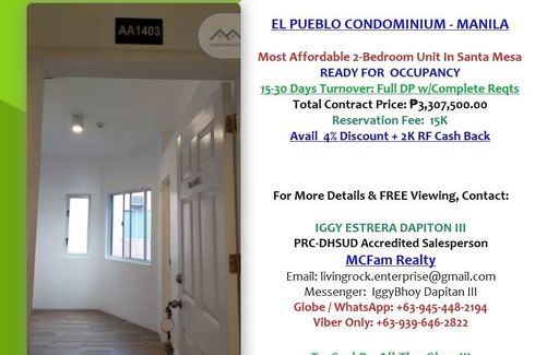 🏈🌽🌹EL PUEBLO CONDOMINIUM – ANNEX A PROJECT THE MOST AFFORDABLE CONDO UNIT IN SANTA MESA AREA ONLY 135K PRICE PER Sq.M.🏈READY FOR OCCUPANCY 24.5sqm 2-BEDROOM TOTAL AREA GRANDE MODEL🏈IDEAL FOR END-USE OR FOR RENTAL BUSINESS - EASY TO LEASE OUT, FEW WALKS AWAY TO PUP MAIN CAMPUS, FULLY SECURED & WELL MAINTAINED PROPERTY🌹🌽🏈