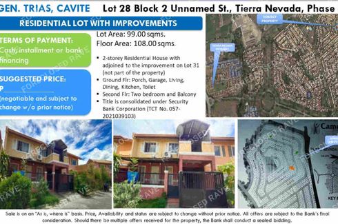 Property address: Lot 28 Block 2 Tierra Nevada Phase 6B, Brgy San Francisco, Gen. Trias, Cavite (Residential Lot with Improvements)