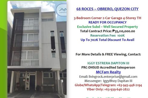 SPACIOUS WELL-SECURED READFY FOR OCCUPANCY 3-BEDROOM w/T&B 2-CAR GARAGE 4-STOREY TOWNHOUSE 68 ROCES - QUEZON CITY