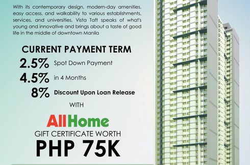 Vista Taft is in the center of Metro Manila, located at Taft Avenue in Malate, Manila, among prominent universities including DLSU, Arellano University, and College of St. Benilde. Pasay and Makati City are also easily accessible. This condo near La Salle Taft is near popular tourist destinations like Rizal Park, Intramuros, and Manila Ocean Park, where visitors and residents can enjoy leisure activities. Mall of Asia Arena, Green Mall, and Robinson's Manila are just a few commercial locations around the condominium.