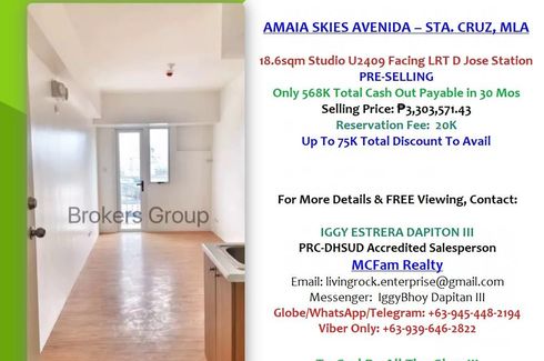 FOR SALE: PRE-SELLING 18.6sqm STUDIO FACING LRT D. JOSE STN/RIZAL AVENUE AMAIA SKIES AVENIDA