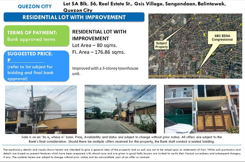 FORECLOSED HOUSE AND LOT FOR SALE Lot 5A Blk. 56, Real Estate St., GSIS Village, Sangandaan, Balintawak, Quezon City (Residential Lot w/ Improvement)