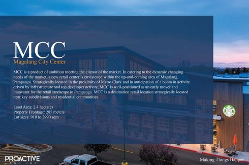 Magalang City Center (MCC) is a product of ambition to meet the clamor of the market. In catering to the dynamic changing needs of the market, a new retail center is envisioned within the up-and-coming area of Magalang, Pampanga. Strategically located in the proximity of Metro Clark and in anticipation of a boom in activity driven by infrastructure by infrastructure and top developer activity, MCC is well-positioned as an early mover and innovator for the retail landscape in Pampanga. MCC is a destination retail location strategically located near key subdivisions and residential communities.