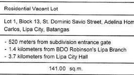 Residential vacant lot for sale in Adelina homes Ph3 Bgy San Carlos Lipa City Batangas.