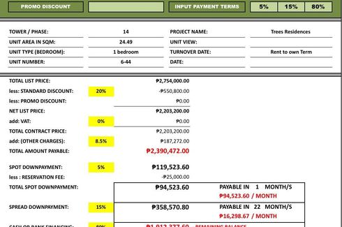 ‹ › 1/16 1 Bedroom Condo for sale in Pasong Putik Proper, Metro Manila Quezon City, Metro Manila ₱ 71,299 (₱ 2,971 / m2) 1 1 24 m2 Condo RENT TO OWN!!!! RENT TO OWN!!Project Name: Trees Residences by SMDCnear SM Fairview, Quezon City‼️70,000+ DP only Move in Agad!!!20% DISCOUNT or With 500,000 Discount!!!!!!‼️BEST FOR RENTAL BUSINESS!!!(Earn As Much As 40K per month)Via AIRBNB Business!! ‼️MOVE IN NOW‼️(minimum 5% downpayment)🔥Studio - 70K+ DP to move-in🔥15% of the Price payable in 22mos no interest!!🔥1 BEDROOM... Call
