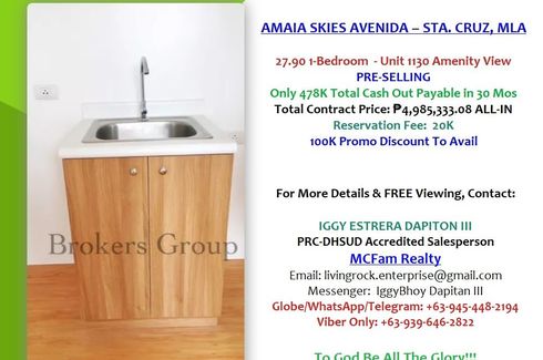 ‹ › 1/20 Virtual tour 1 Bedroom Condo for sale in Manila, Metro Manila Manila, Metro Manila ₱ 4,985,333 (₱ 184,369 / m2) 1 1 27.04 m2 Condo Swimming pool Air conditioning Gym Internet Security Car park Garden Children's area +12 FOR SALE: PRE-SELLING 27.90sqm 1-BEDROOM FACING AMENITIES AMAIA SKIES AVENIDA✔️ Pre-Selling 27.90sqm 1-Bedroom✔️ Unit 1130FACING AMENITIES✔️ Selling Price: ₱4,985,333.08 ALL-IN✔️ 10K Reservation Fee✔️ Only 478K Total Cash Out Payable in 30 Months✔️ 90% TCP Balance payable in Cash or Bank Financing✔️ Tower 2 Expected Turnover 4Q of 2024FUNCTIONAL AMENITIES🔜 Swimming... Call