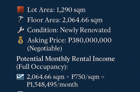 FOR SALE – Commercial Building along Marcos Highway, Pasig City🧱 Lot Area: 1,290 sqm🏢 Floor Area: 2,064.66 sqm🔧 Condition: Newly Renovated💰 Asking Price: ₱380,000,000 (Negotiable)✅ Potential Monthly Rental Income (Full Occupancy):📐 2,064.66 sqm × ₱750/sqm = ₱1,548,495/month📈 Potential Annual Income: ₱18,581,940💹 Projected ROI: 4.89% per annum🪧 Bonus Potential:Due...