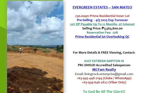 FOR SALE 230.0sqm PRIME RESIDENTIAL LOT (INNER) EVERGREEN ESTATES-SAN MATEO OVERLOOKING & 30MINS DRIVE TO QUEZONN CITY