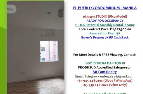 🍀🌹🐯EL PUEBLO CONDOMINIUM – ANNEX A PROJECT THE MOST AFFORDABLE CONDO UNIT IN SANTA MESA AREA ONLY 135K PRICE PER Sq.M.🏈READY FOR OCCUPANCY 16.5sqm STUDIO TOTAL AREA RICO MODEL🏈IDEAL FOR END-USE OR FOR RENTAL BUSINESS - EASY TO LEASE OUT, FEW WALKS AWAY TO PUP MAIN CAMPUS, FULLY SECURED & WELL MAINTAINED PROPERTY🐯🌹🍀