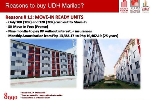 Urban Deca Homes MarilaoLocation: Abangan Sur, Marilao Bulacan P10,000 Cash Out For 1 and 2 bedroomMidrise Condominium / 4 storey building with elevatorUnit Features:- all units with kitchen counter top, overhead cabinets, tiles bathrooms with bath fixtures, painted and vinyl tiled finished units, also included aluminum windows with clear glass.Amenities:• clubhouse• swimming pool• basketball...