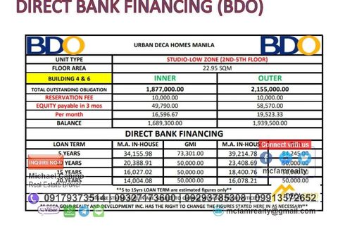 ‹ › 1/12 1 Bedroom Condo for sale in Tondo, Metro Manila Manila, Metro Manila ₱ 2,075,000 (₱ 75,675 / m2) 1 1 27.42 m2 Condo Condo For Sale Near Santa Isabel College Urban Deca Manila Rent to Own thru PAG-IBIG, Bank or In-housePAG-IBIG RENT TO OWN Condo IN MANILA AREAURBAN DECA HOMES MANILARENT-TO-OWNPWEDENG PAUPAHAN, AIRBNB, or STAYCATION 1.7M to 1.9M 22.95 sqm Reserve now for only 10K w/ diwcount of 47K Direct to PagIBIG at 10,733 monthlyMichael CaninoReal Estate Broker and AppraiserSun: 0932717----Globe: 0917937----Smart:... Michael Canino Call