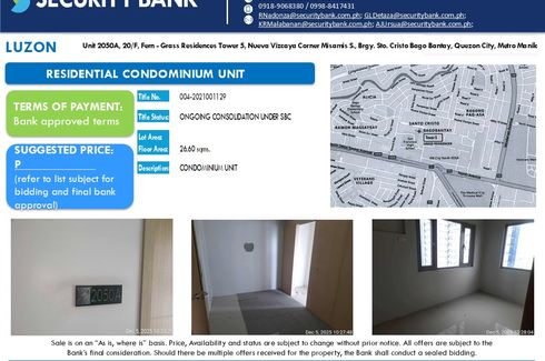 ‹ › 1/1 Condo for sale in Ramon Magsaysay, Metro Manila near LRT-1 Roosevelt Quezon City, Metro Manila ₱ 4,000,000 Condo Unit 3619 36th Floor Grass Residences Tower 2 Nueva Vizcaya corner Misamis and Nueva Ecija Streets Barangay Sto Cristo Quezon City Metro ManilaProperty Classification: Green Tag (in possession, with complete property documents)Mode of payment/sCash, via BPI Financing ( subject to a separate approval ), via other bank financingNote:- It is expected from buyers to conduct due diligence including actual... Buena Mano Verified seller Call