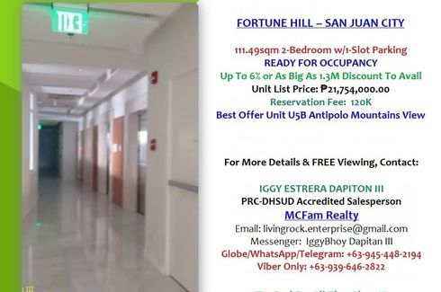 ‹ › 1/17 Virtual tour 2 Bedroom Condo for sale in Addition Hills, Metro Manila San Juan, Metro Manila ₱ 23,710,000 (₱ 189,332 / m2) 2 3 125.23 m2 Condo Swimming pool Air conditioning Gym Internet Security Car park Garden Children's area +18 BEST OFFER UNIT U5A ANTIPOLO MOUNTAINS VIEW 2-BEDROOM w/1-SLOT PARKING, FOYER & LEDGE FORTUNE HILL – SAN JUAN CITY🔖READY FOR OCCUPANCY 125.23sqm 2-BEDROOM w/Parking🔖Best Unit U5A Facing Antipolo Mountains - GOLD Tower🔖Selling Price: ₱23,710,000.00🔖Only 120K Reservation Fee🔖Inclusive of 1-Slot Parking, Exclusive Elevator Lobby & Ledge🔖Up To 6% or As Bis As 1.4M Total DISCOUNT To... Michael Canino Call