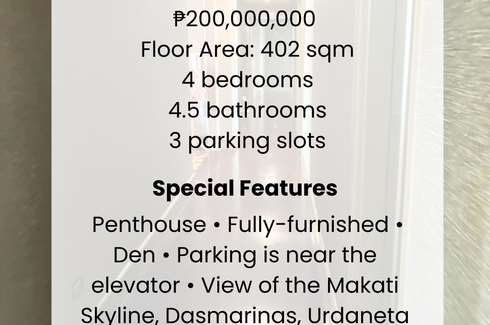 ‹ › 1/7 4 Bedroom Condo for sale in Urdaneta, Metro Manila near MRT-3 Ayala Makati, Metro Manila ₱ 128,000,000 (₱ 335,079 / m2) 4 5 382 m2 Condo Step into a luxurious living experience with this spacious 4-bedroom Condominium at Discovery Primea, one of Makati’s most sought-after addresses. Perfectly designed for modern living, this home offers both comfort and style with stunning panoramic views and first-class amenities.Property Details:Floor Area: 382 sqmBedrooms: 4Bathrooms: 5Parking: 2 dedicated slotsView Orientation: East-facing... 27C Realty Verified seller Call