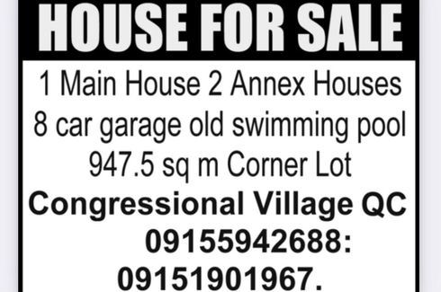 ‹ › 1/2 12 Bedroom House for sale in Bahay Toro, Metro Manila Quezon City, Metro Manila ₱ 125,000,000 (₱ 131,996 / m2) 12 8 947 m2 House LOCATION: Congressional Village Phase 1, Congressional Avenue, Quezon City.DETAILS: 1 Main House, 2 Annex Houses, a Tree House, old pool.The MAIN House has 2 living rooms, 2 offices, a conference room, receiving room, 6 bedrooms and 6 toilet and bath.The 2 Annexed Houses has 6 bedrooms, 2 toilet and bath.The compound can accommodate 8 vehicles inside.Sale Price: 125,000,000 NegotiableCONTACT INFORMATION:... Veronica Dominguez Call