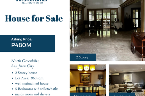 ‹ › 1/6 5 Bedroom House for sale in Greenhills, Metro Manila San Juan, Metro Manila ₱ 480,000,000 5 5 960 m2 House FOR SALE: 2 STOREY HouseNORTH GREENHILLSLot Area: 960 sqm. well maintained House2 storey House5 Bedrooms5 toilet&bathsmaids room and driversAsking: P480M gross, slightly negotiable. Natividad Chong Verified seller Call