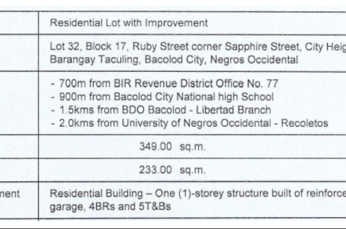 ‹ › 1/2 3 Bedroom House for sale in Taculing, Negros Occidental Bacolod, Negros Occidental ₱ 2,028,500 (₱ 20,285 / m2) 3 2 100 m2 House Internet Security Car park Garden Electricity Water PROPERTY FOR SALE in Golden River Village, Brgy. Taculing, Bacolod City, Negros OccidentalNote : NO TO BROKER/AGENT. This property is subject for approval and being offered at "As is, where is" term. Minimum offer must be equal or higher than the indicated price, if lower than that automatic disapproval.Exact Location : Lot 15, Block 7, Pearl St., Golden River Village, Brgy. Taculing, Bacolod City,... Clarisse Tolentino Verified seller Call