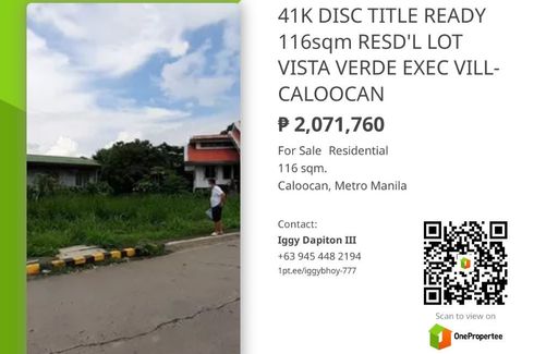AVAIL 41K DISCOUNT RESERVE 116.0sqm RESIDENTIAL LOT VISTA VERDE EXECUTIVE VILLAGE-CALOOCAN