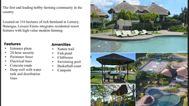 Located on 116 hectares of rich farmland in Lemery, Batangas, Leisure Farms integrates residential resort features with high-value modern farming. It offers homeowners a safe and delightful place for hobby farmers and their families to spend productive weekdays and blissful weekends.