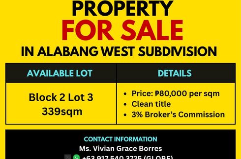 Alabang West Commercial LotLot Area: 1,260 sqmTotal Contract Price: Php 262,335,000.00Payment Terms:Option 1Cash Payment: with 15% Discount (will become Php 222,984,750)Option 210% Downpayment (Php 24,937,565.10)90% payable in 60 months (Php 3,740,634.77 per month)Option 35% Downpayment (Php 12,468,782.55)80% payable in 60 months (Php 3,325,008.68 per month)2.5% lumpsum payable on 10th, 20th, 30th,...