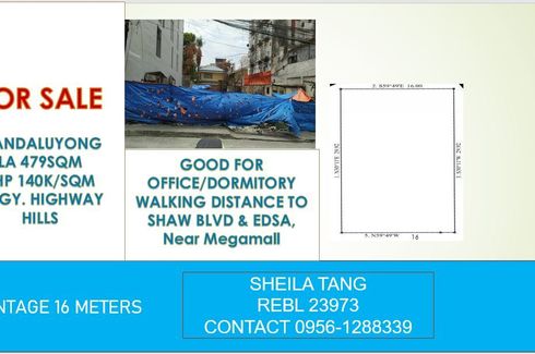 ‹ › 1/7 Land for sale in Highway Hills, Metro Manila near MRT-3 Shaw Boulevard Mandaluyong, Metro Manila ₱ 67,060,000 479 m2 FOR SALE Brgy. HIGHWAY HILLS, Mandaluyong CityLA 479 sqmPrice: P140,000 per sqm (Negotiable)16 meters frontageGreat for commercial useGood for office, dormitory building Accessible to Shaw Blvd., Edsa.Feel free to scheduled a viewing:Sheila TangPRC 23973 Grand Galilee Realty Verified seller Call