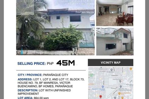 Bank Foreclosed Lot for SaleWith Unfinished HouseContact #: 0927472----Property Address: Lot 1, Lot 2 and Lot 17 Block 73, House No. 79, BF Manresa, Victor Buencamino, BF Homes, Paranaque City, Metro ManilaLot Area: 864 sqmSelling Price: 38,020,000Below Market PriceTerms of Payment:Option 1: CashOption 2: 20% Down Payment 80% Bank FinancingAll potential buyers are advised to conduct own due diligence...
