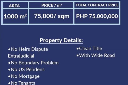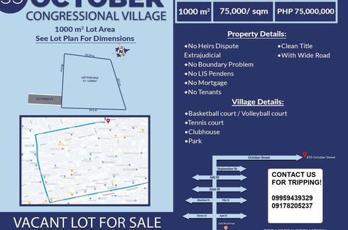 ‹ › 1/1 Land for sale in Bahay Toro, Metro Manila Quezon City, Metro Manila ₱ 75,000,000 1,000 m2 Security Vacant Lot for SaleLocation: Congressional Village, Quezon CityLot area: 1,000sqmClassification: ResidentialSelling price: P75,000,000.00 (P75,000.00/sqm)Property details:- Unoccupied- clean title- wide road- Gated private subdivision- updated taxes- No heirs dispute extrajudicial- No boundary problem- No mortgage- No tenants- No US pendens*Prices and availability subject to change without prior notice CTY Real Estate Verified seller Call