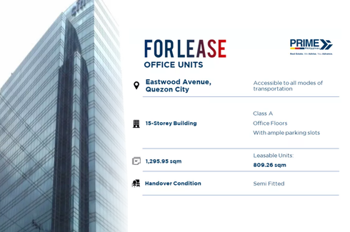 ‹ › 1/1 Office for rent in Bagumbayan, Metro Manila Quezon City, Metro Manila ₱ 83,052 / month 138.42 m2 Office Looking for a functional office space with a prime location? This 30th-floor unit in Eastwood, Quezon City offers 138.42 sqm of space that’s ready to accommodate your business needs.Property Details:Location: Eastwood, Quezon CityFloor: 30th FloorFloor Area: 138.42 sqmType: Office spaceSecurity Deposit: 3 monthsAdvance Payment: 3 monthsMonthly Rent: Php 83,052 (Php 600/sqm, VAT excluded)Association... 27C Realty Verified seller Call