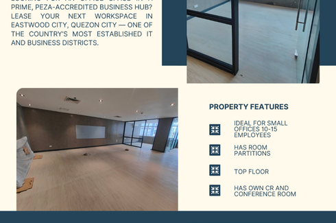 ‹ › 1/1 Office for rent in Bagumbayan, Metro Manila Quezon City, Metro Manila ₱ 122,912 / month 153.64 m2 Office Located on the 10th floor of a modern building in the bustling Eastwood City, this 153.64 sqm office space offers a practical and flexible layout for your business needs. With easy access to the city’s key areas, this space provides a perfect environment for growth and productivity.Property Details:Floor Area: 153.64 sqmMonthly Rent: ₱122,912 + Association Dues of ₱195/sqm (paid quarterly)Payment... 27C Realty Verified seller Call