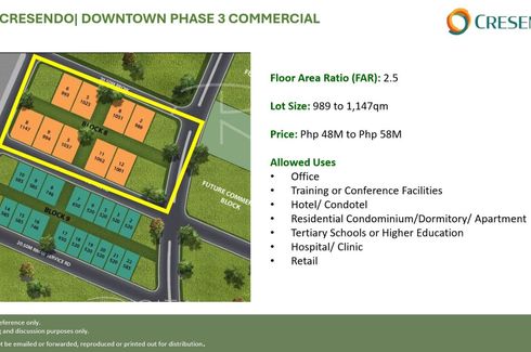 FOR LEASE:Prime Commercial Lots @ CRESENDO - an AYALA LAND ESTATE, TARLAC CITY, LUZONTOTAL COMBINED LOT AREA: 2,530 sqm (lots can be leased separately) LEASE RATE: P380/sqm PERMITTED USE: Restaurants/Food Chains, Car/Vehicle Showroom, Health Wellness & Sports Shops, Beauty, Wellness & Aesthetic Clinics, Commercial Office Space/Showroom, and other retail shops, Hotel/Bed & Breakfast, Events Place, Gym,...