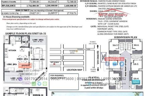‹ › 1/16 3 Bedroom Townhouse for sale in Kaypian, Bulacan San Jose del Monte, Bulacan ₱ 4,595,000 (₱ 63,819 / m2) 3 2 72 m2 Townhouse Swimming pool Gym Security Car park Children's area Panoramic view Video cable Eminenza Residences 1 READY FOR OCCUPANCY- 3 bedrooms / 2 bathroom- carport - kitchen / service area / balcony / drying areaLocation: Brgy. Kaypian, SJDM Bulacansample computationtownhouselot area: 60sqmfloor area: 72.97sqmtotal price: 4,595,000reservation: 10,000downpayment: 909,0006 mos to pay: 151,50012 mos to pay: 75,750balance: 3,676,000bank financing:20yrs: 35,474 Michael Canino Call