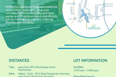 Residential Lots for sale in Vermosa, CaviteAvailable Lots:Lot Area: 1,370 sqm- 3,485 sqmPrice per sqm:Php 120,000 - Php 135,000Selling Price:Php 172 - Php 453 millionVermosa by Ayala Land Estates:Ayala Land is pioneering a new brand of active suburban lifestyle with Vermosa in Cavite, a sprawling 700-hectare estate located in Imus and Dasmariñas, along Cavite’s scenic Daang Hari corridor. Vermosa...