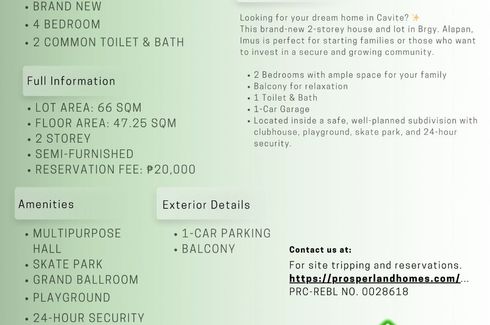 ‹ › 1/7 2 Bedroom House for sale in Poblacion I-A, Cavite Imus, Cavite ₱ 4,453,000 (₱ 94,243 / m2) 2 1 47.25 m2 House Car park Garden Balcony 24-hour security Children's area Electricity Water Built-in kitchen +1 FOR SALE: HOUSE AND LOT IN CAVITELocation: Brgy. Alapan, Imus, CaviteSPS-HL-25-26BCFOR VIEWING SCHEDULE:👉 prosperlandhomes.comEXPLORE MORE PROPERTIES:👉 www.prosperlandhomerealty----PROPERTY DETAILS• Selling Price: ₱4,453,000• Reservation Fee: ₱20,000HOME FEATURES• Lot Area: 66 SQM• Floor Area: 47.25 SQM• 2-Storey – Brand New• 2 Bedrooms• 1 Toilet & Bath• 1 Car Garage•... PROSPERLAND HOME REALTY Verified seller Call