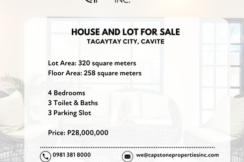 Location: Raffi'S Way Luxury Villa, San Jose, Tagaytay, CaviteNo. of Bedroom(s): 4No. of Bathroom(s): 6Lot Area: 4,019 sqmFloor Area: 1,000 sqmParking Slots: 8Description: OR SALE: Iconic Tagaytay Luxury Villa- A Budji Layug designed timeless masterpiece- Lot Area: 4,019 sq.m- Floor Area: 1,000 sq.m- 2.5+ storey sprawling, terraced style property that blends w/ nature- 4 Bedroom- 6 Bathroom- 8 car...