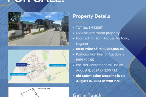 Residential Lot for Sale located in Barangay San Roque, Victoria, LagunaArea: 1,631 sq.m.Bid submission deadline: August 15, 2024 at 2:00pmBase Price: Php 3,262,000.00For inquiries, contact us at (02) 8818-----, (02)8817----- or 0993729----Privatization and Management Office, Makati City
