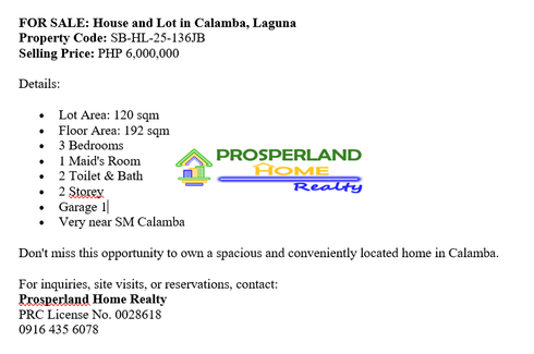 BRAND NEW HOUSE AND LOT COMPLETE LOCATION : Brgy 5 Calamba ,Laguna Unit 10 End Lot SELLING PRICE: 5,500,000 Lot Area: 110 SQM Floor Area: 135SQM Terms of Payment: CASH it thru BANK FINANCING Thru Bank Financing Prices 5,500,000 Downpayment 1,100,000 Loanable 4,400,000 Monthly amortization 8% per annum 20 years 36,801 15 years 42,050 10 years 53,385 5 years 89,001 House Features: 4 Bedrooms, 4Toilets...