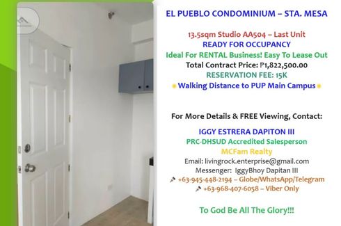 ‹ › 1/9 1 Bedroom Condo for sale in Santa Mesa, Metro Manila near LRT-2 V. Mapa Manila, Metro Manila ₱ 1,400,000 (₱ 93,333 / m2) 1 1 15 m2 Condo Affordable Rent to Own Condominium in Santa Mesa Manila Near PUPEl Pueblo Manila CondominiumAnonas St. Sta.Mesa walking distance from PUP Main Campus Sta.Mesa ManilaAre you looking for a unit to stay? or pwede rin maging RENT TO OWN while you’re staying!Habol na while we have units at AT EL PUEBLO MANILA CONDORMITEL.Malapit lang po sa PUP main campus! Hurry limited units avail!WITH a BIG Discount... Michael Canino Call