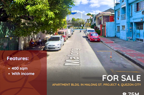‹ › 1/1 Shophouse for sale in Marilag, Metro Manila near LRT-2 Katipunan Quezon City, Metro Manila ₱ 75,000,000 400 m2 Shophouse For Sale: Apartment Building located at Malong St., Project 4, Quezon CityLot area: 400 sqmWith income: P350k per monthPrice: P75M negoID: JGZ4430Under PRC12640 Grandeur Realty Verified seller Call