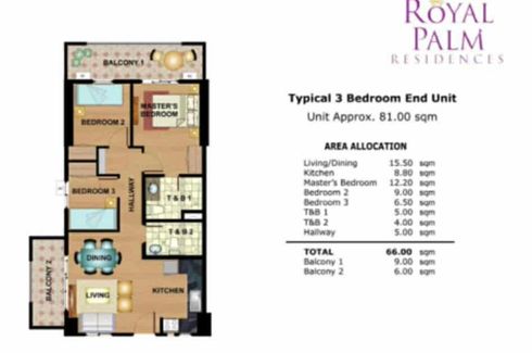 3-BR CORNER UNIT FOR SALE AT ROYAL PALM RESIDENCES, ACACIA ESTATE, TAGUIG CITY 15th Floor High-Rise Kamala Building-3BR, 2 Bathrooms -Corner Unit w/ 2 big balconies facing West side & East side.-Great view of Sunrise & Sunset. View of BGC, Makati & Laguna de Bay, & Tanay, Antipolo, Rizal.-Just minutes drive to BGC, SM Aura, Market Market, Serendra, Bonifacio High Street, Finance Center.-Biggest DMCI...